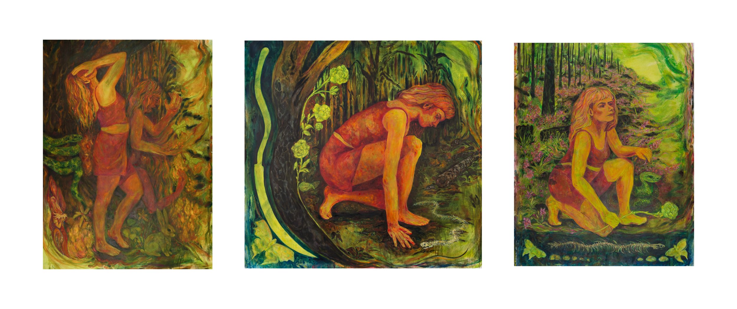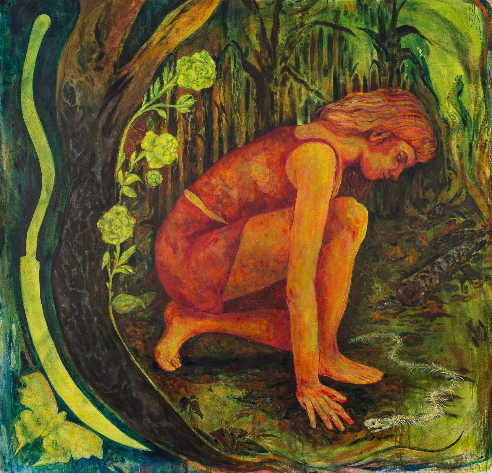 I am drawn to the continuous patterns of growth, decay, and regeneration — natural cycles that mirror the processes of womanhood, identity, and grief. These states of transformation serve as metaphors within my work, where personal and archetypal narratives intertwine. My practice is shaped by an interest in how inherited stories form identity. Over the past year, I found myself repeatedly returning to the narrative of Eve and the serpent, seeking to reclaim her not as the origin of humanity’s fall, but as a bearer of wisdom. In these paintings, the encounter between the woman and the snake is reframed as luminous and benevolent, an exchange guided by forces of metamorphosis, protection, and ancestral knowledge.