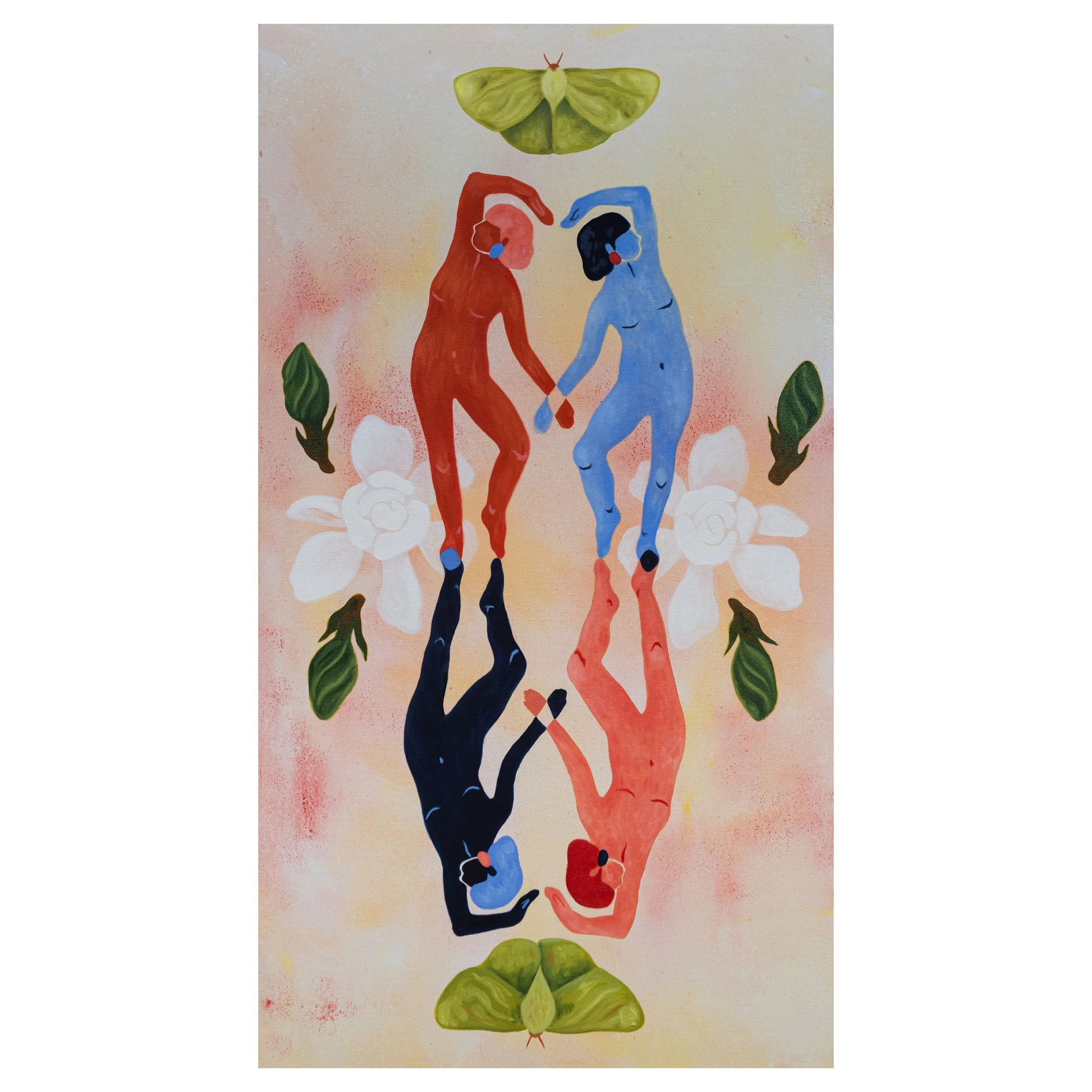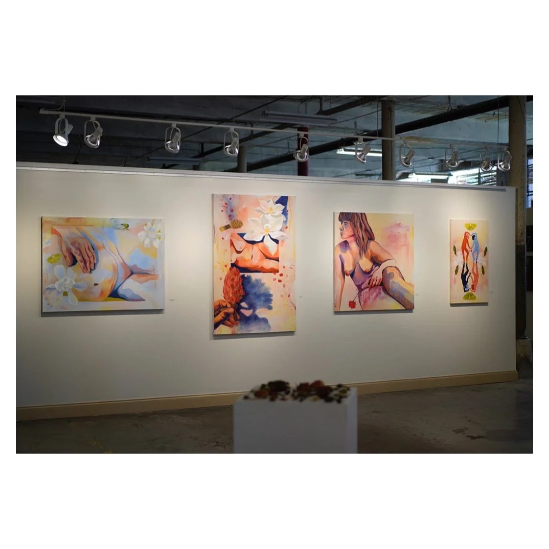 With ruminations and meditations around nostalgia, desire, regret and dignity, this work contemplates summer experiences as an adult versus a child. The work is reminiscent of my childhood summers, spent climbing the branches of magnolia trees, chasing butterflies, sunburns, popsicles stains and the lingering scent of gardenias. The paintings are meant to feel like scrapbook memories, with creatures, charms, and textures of summer. They are a reflection on summer as a season and as a life lesson, reminding us to embrace the lush, liveliness of it all, while simultaneously acknowledging the impermanence of it, knowing the flowers will wilt and the daylight will dwindle.