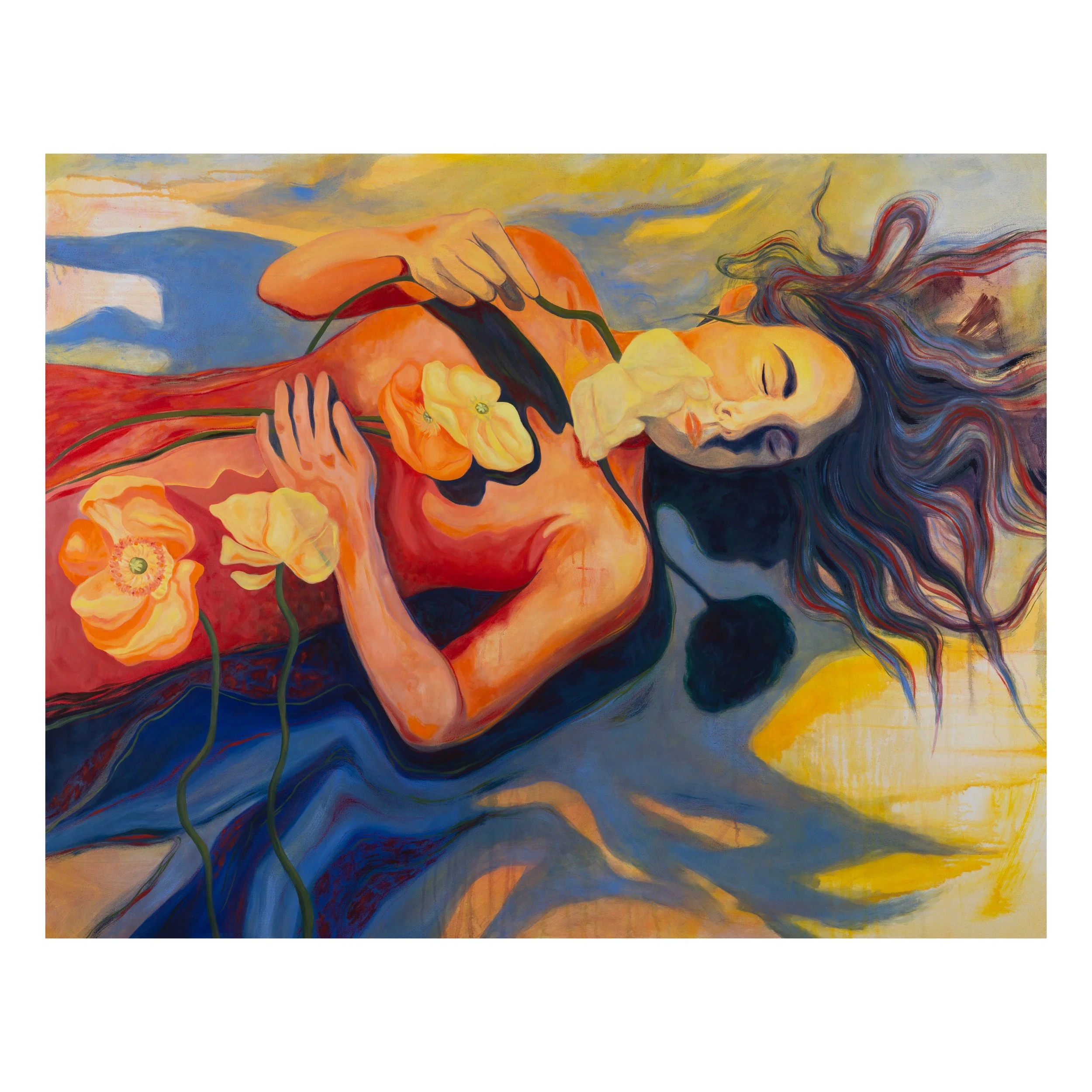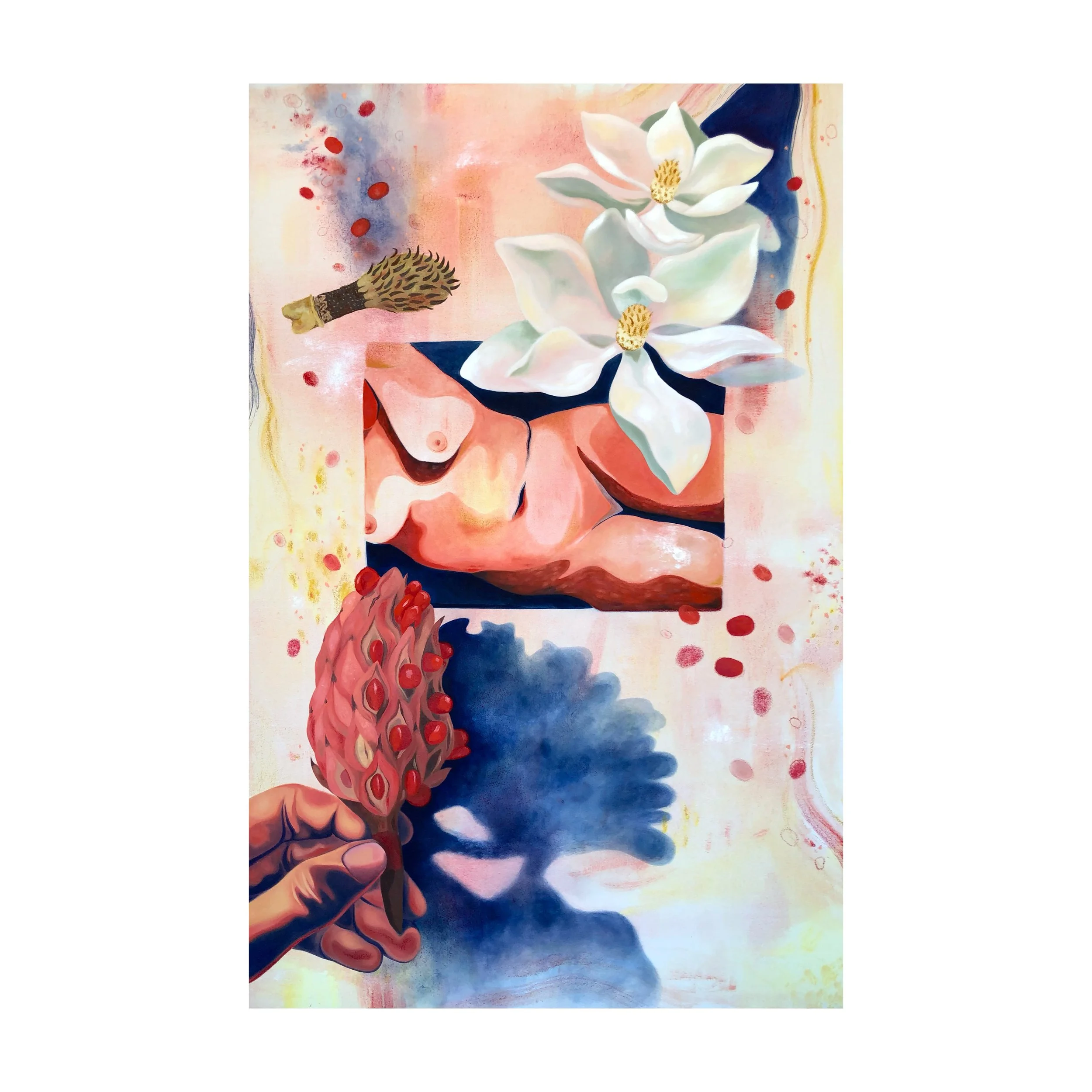 It is my intention for the female form to hold a distinct and dignified “mother nature” presence in the work, highlighting the power that women hold to nurture and grow, especially during a time when bodily autonomy rights are being stripped away. The female form, either blending in or starkly emerging, symbolizes the versatility of women and our ability to seamlessly go through cycles, parallel with nature. Through my curiosity and admiration of the cycles of nature, I am reminded that the magic, mystery and multitude of beauty and change that exists within nature, also exists within us.
